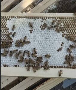 reaches around 12°C/8°C if the bees get too hot or too cold they will die, when the bees get too hot the worker bees place droplets of water on the capped brood and create a mist by fanning their wings to cool the hive down and to heat it up the bees fuel up on honey to keep their wings fit and healthy (people who keep bees that live in a colder climate somewhere like Canada they will bring their bees in the a barn to keep them warm through the winter months), also if it snows we have to clear the doors and make sure the bees are still getting a good air